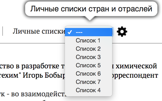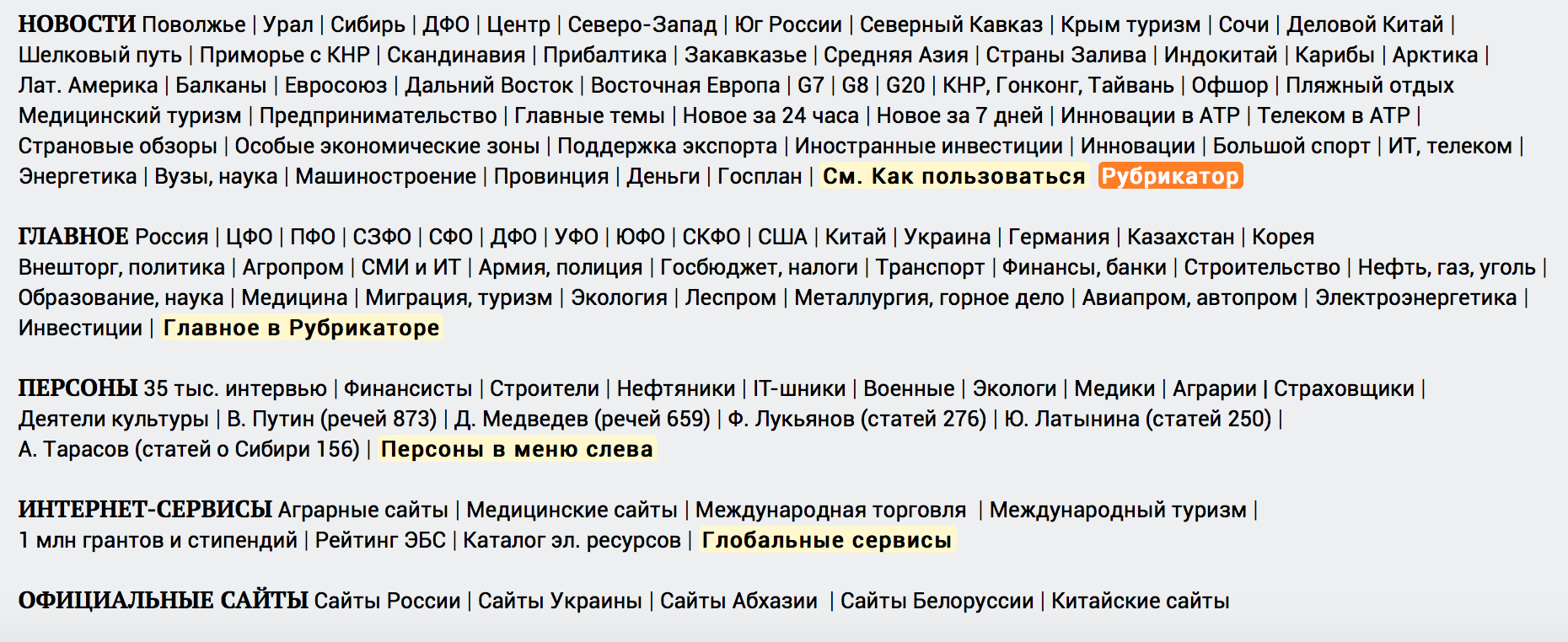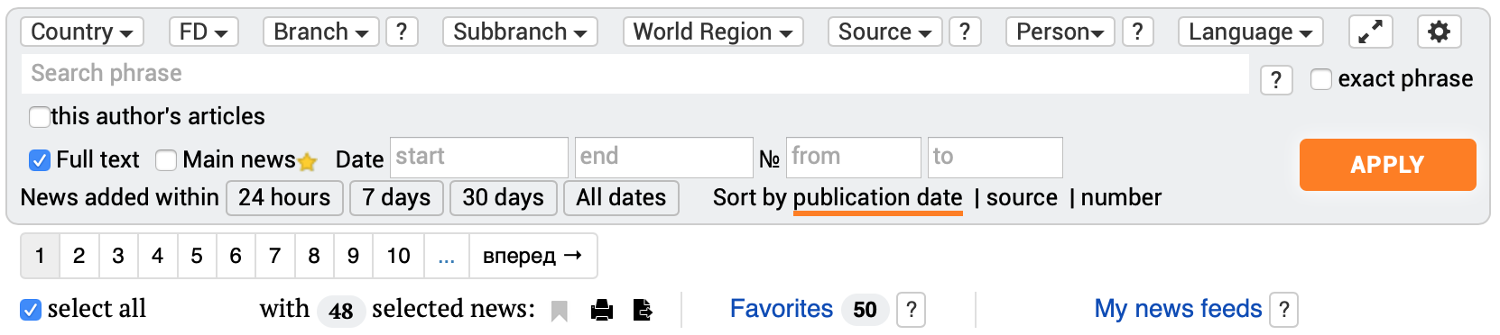 The rubricator with settings for work with the array of full-text business articles. Separate fields include: search area / industry sector / source / date / country / RF federal district / world region / main / personalities / personal lists / mark / favorites. For a detailed study of the rubcitaor you should head over to the Tour page.