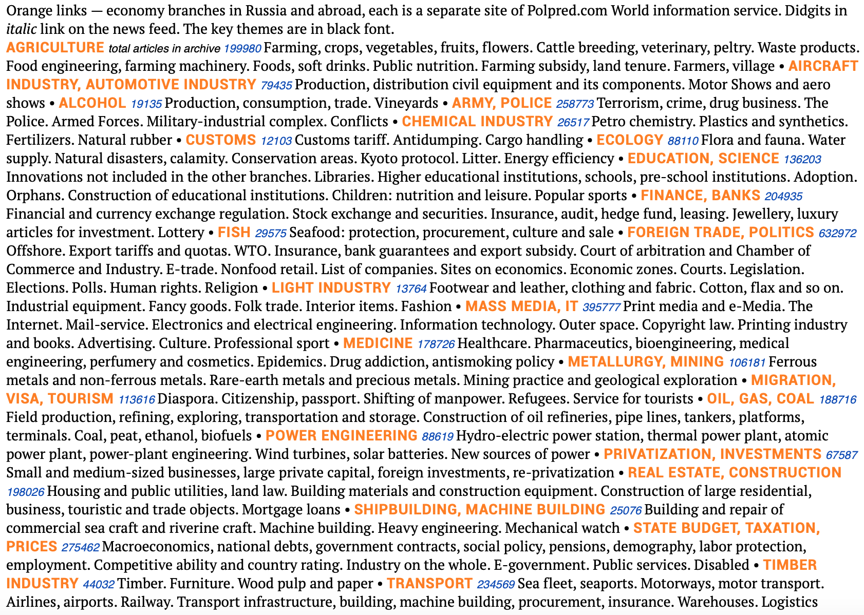 2. Learn by heart the list of 26 industry groups (red capital letters, live links); 53 sub-sectors of Russia and abroad (blue letters, live links); keywords for each industry group. We give news about grapes in the “Alcohol” section, flax and cotton appear in the “Light industry”, and mineral fertilizers - in the “Chemical industry” section. Although all the above items are close to the “Agribusiness” section, they are not included in it. It is necessary to learn like the multiplication table the list of sectors / sub-sectors / keywords, to know what to look for and where.