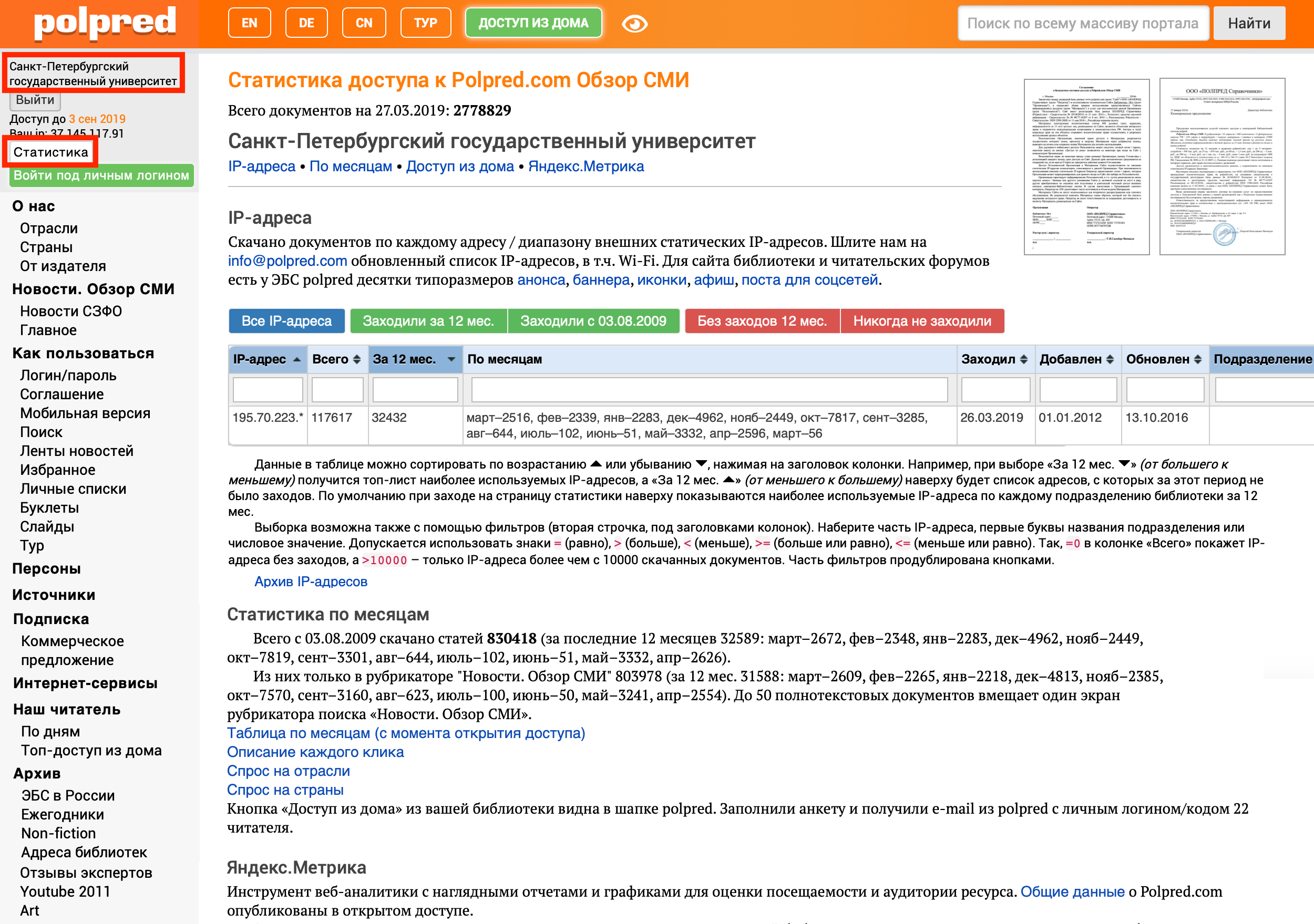 Wish to check if the access is functioning? When you enter the polpred.com website you can see the name of the library, period of availability and Statistics key in the upper left-hand corner of the screen. If the library name is not seen, you should check whether IP-addresses of your institution have been changed. You need you to check which IP-address is determined by your system when entering the website http://polpred.com/catch.html and send us this address.